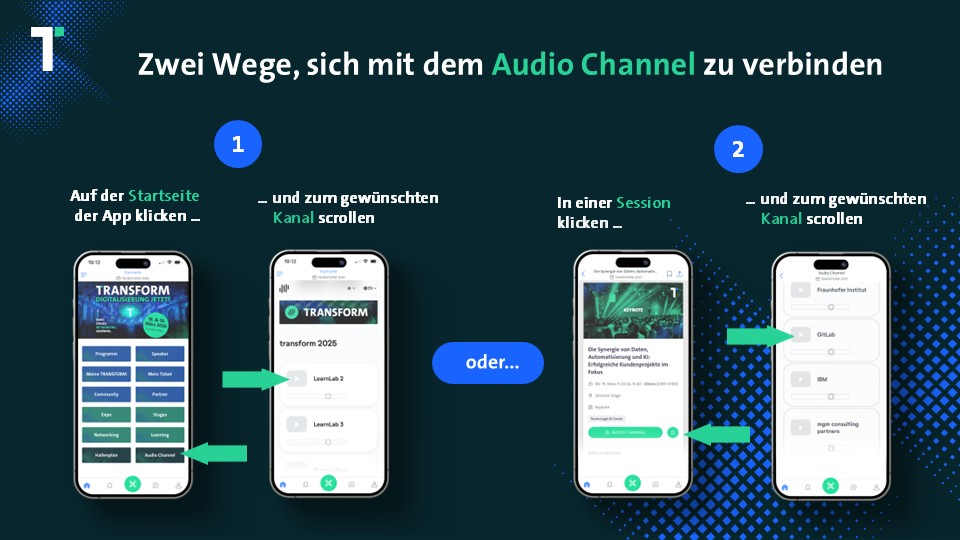 Die TRANSFORM App ist mehr als nur ein Tool; sie ist Ihr persönlicher Assistent, konzipiert, um Ihre Event-Erfahrung zu verbessern. Laden Sie die App herunter, vervollständigen Sie Ihr Profil und beginnen Sie noch heute, Ihr individuelles TRANSFORM-Erlebnis zu gestalten.